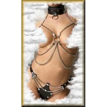 Leather and Chain 2 Piece Set. Top: Adjustable Neck and Back. G-string: Side Buckles and Elastic Back. One Size.
